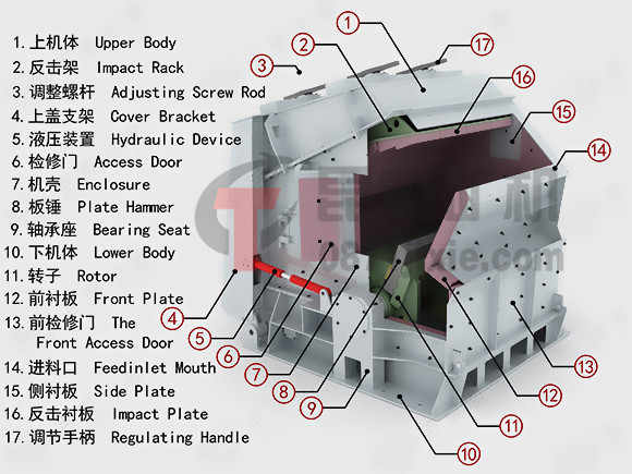 反擊板與板錘間隙能方便調節,有效控制出料粒度,顆粒形狀好。