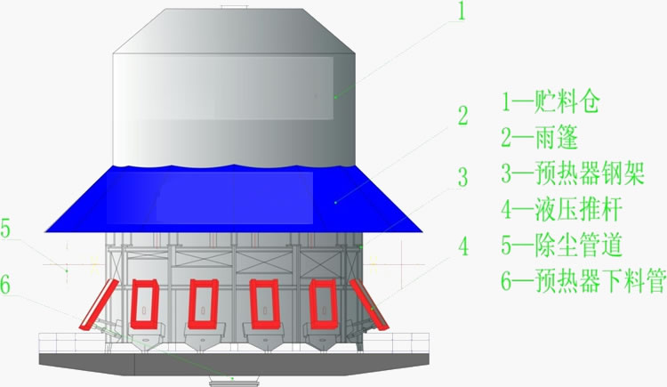物料由豎式預熱器頂部料倉經下料溜管導入豎式預熱器本體預熱室內,同時在窯尾引風機所產生的負壓的作用下將來自回轉窯窯尾煅燒所產生的高溫煙氣引到預熱器內部,1000攝氏度左右的高溫煙氣在穿過物料時,與其發生熱交換,將物料預熱至800攝氏度以上,再由預熱器周邊布置的液壓推料裝置依次將預熱好的物料推出,穿越過料層的高溫煙氣的熱量大部分被物料吸收,排出的煙氣溫度約為240攝氏度左右,從而完成整個熱交換過程;每個液壓推料裝置均采用單獨的液壓缸驅動耐熱鋼推頭進行工作,通過PLC控制系統可以調節推頭之間的間隔時間及推頭自身的推料時間,準確控制進料量。最后經下料溜槽和轉運溜槽進入回轉窯尾部進行煅燒。