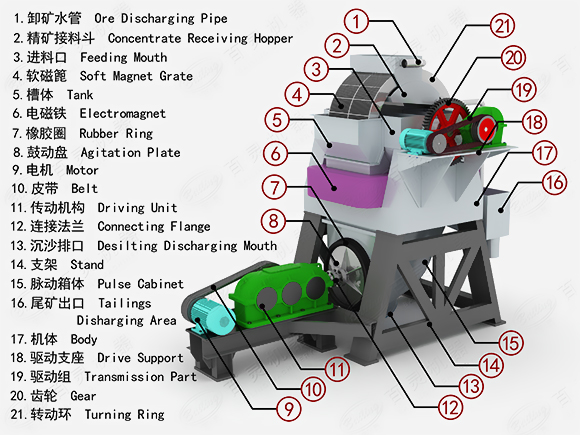 采用特殊的開放式磁路設計,實現了磁場強,磁場作用深度大,磁場梯度合理,具有處理量大、礦物不堵塞、分選效果好等特點。